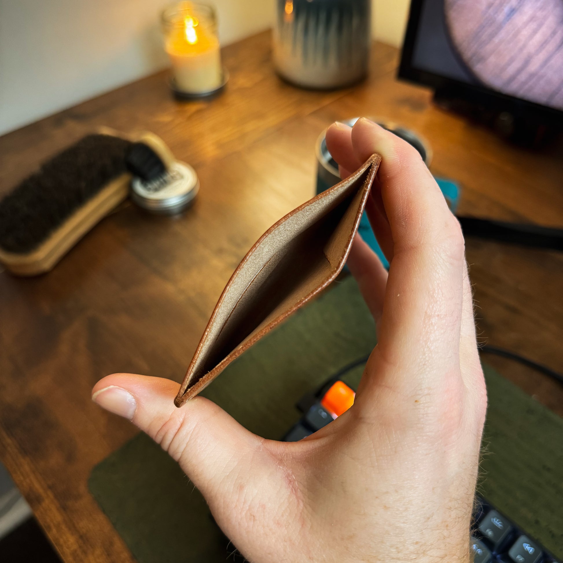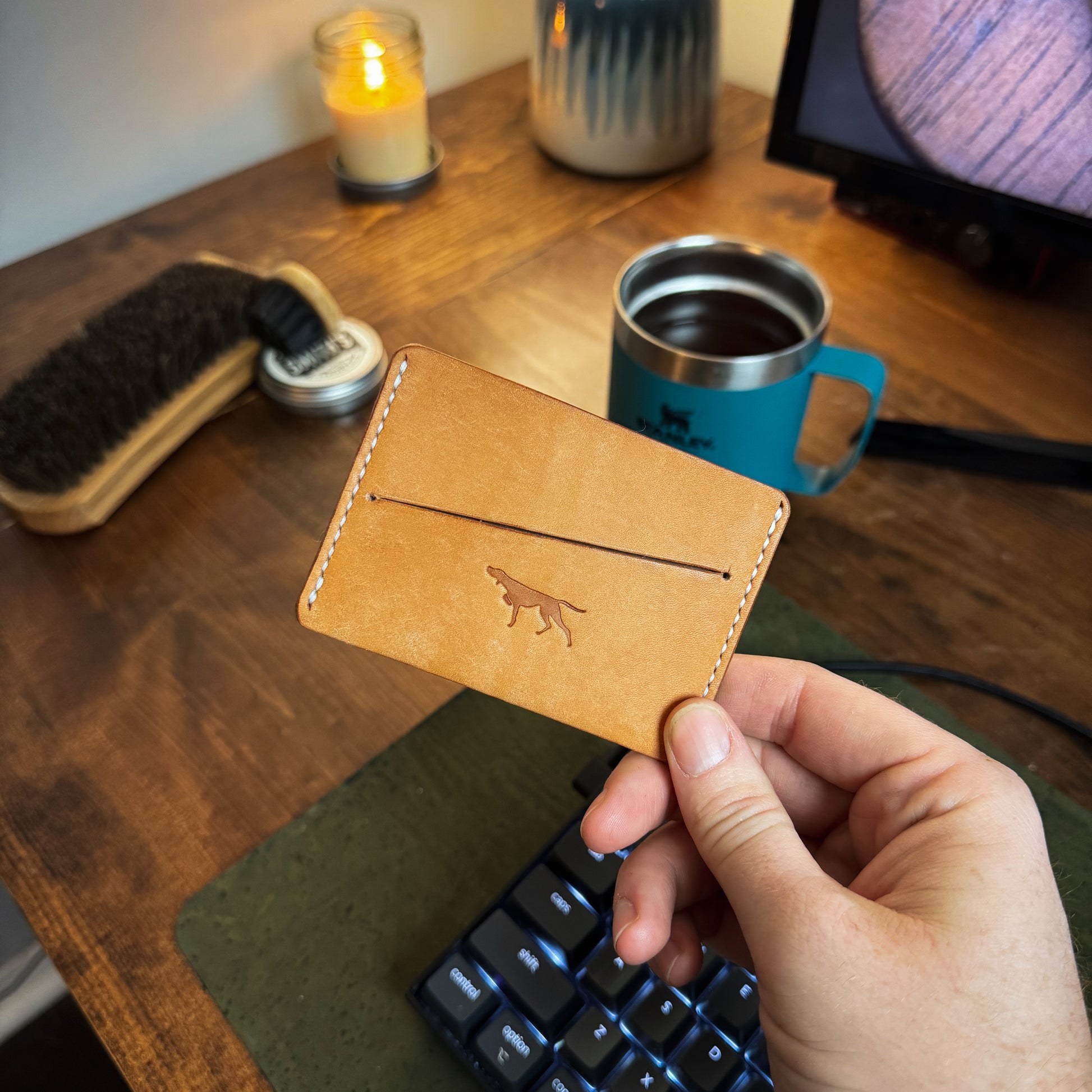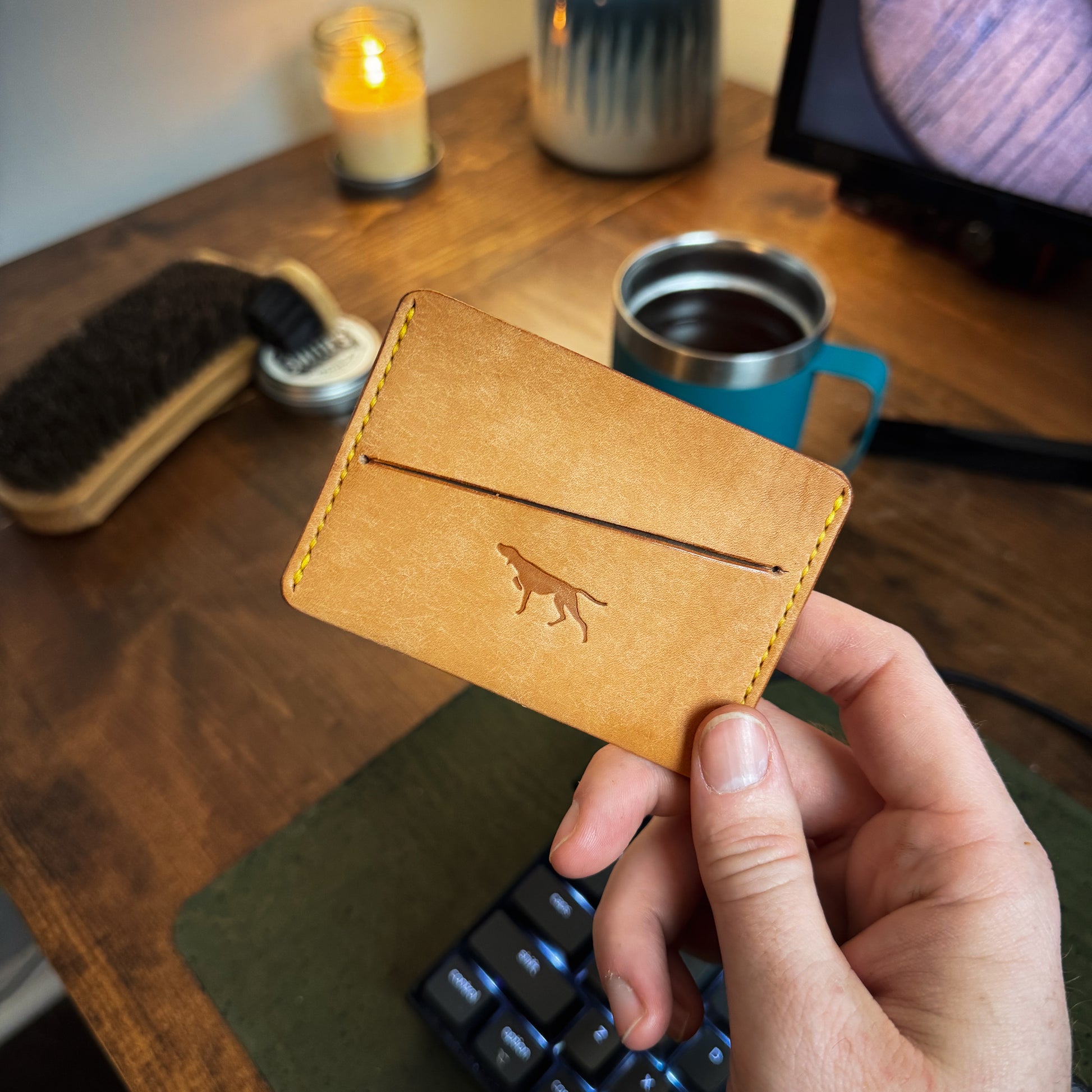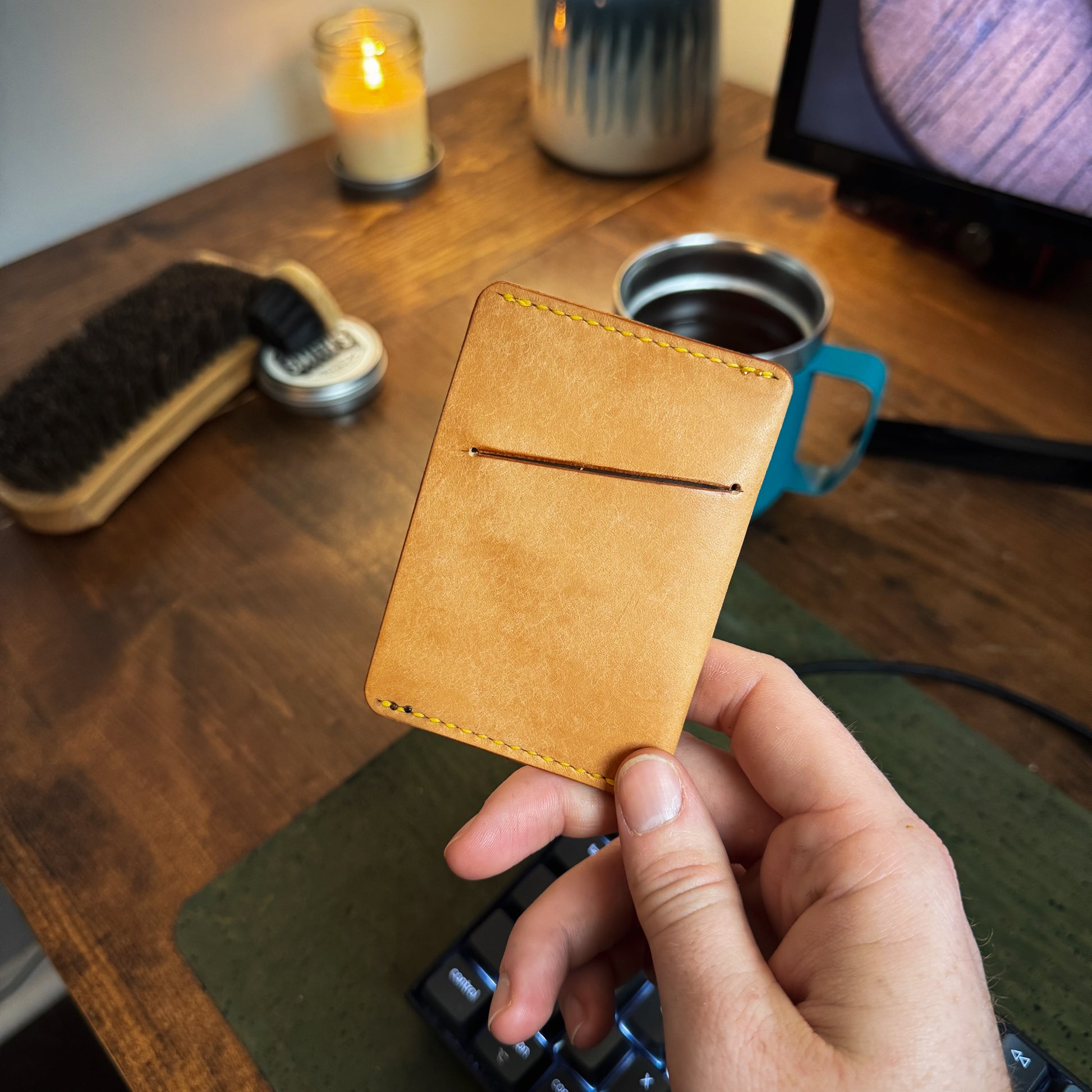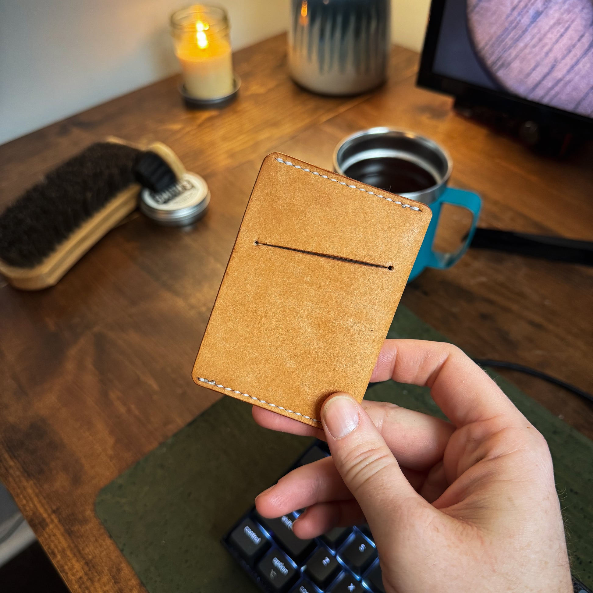 All of my wallets are made using full-grain veg-tanned leather. This leather is as durable as it comes and will get better as it ages. Veg tan leather patinas amazingly. It will darken and get scratches/nicks that will make the wallet unique to you. It really is beautiful and with the durability of this leather, it's bound to tell a story that is uniquely yours.