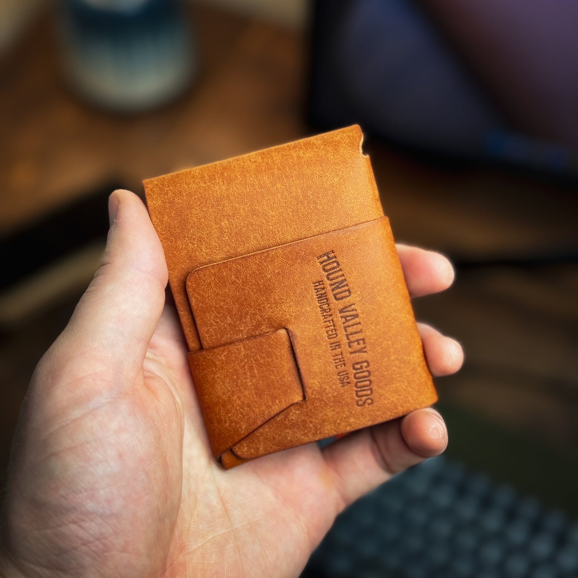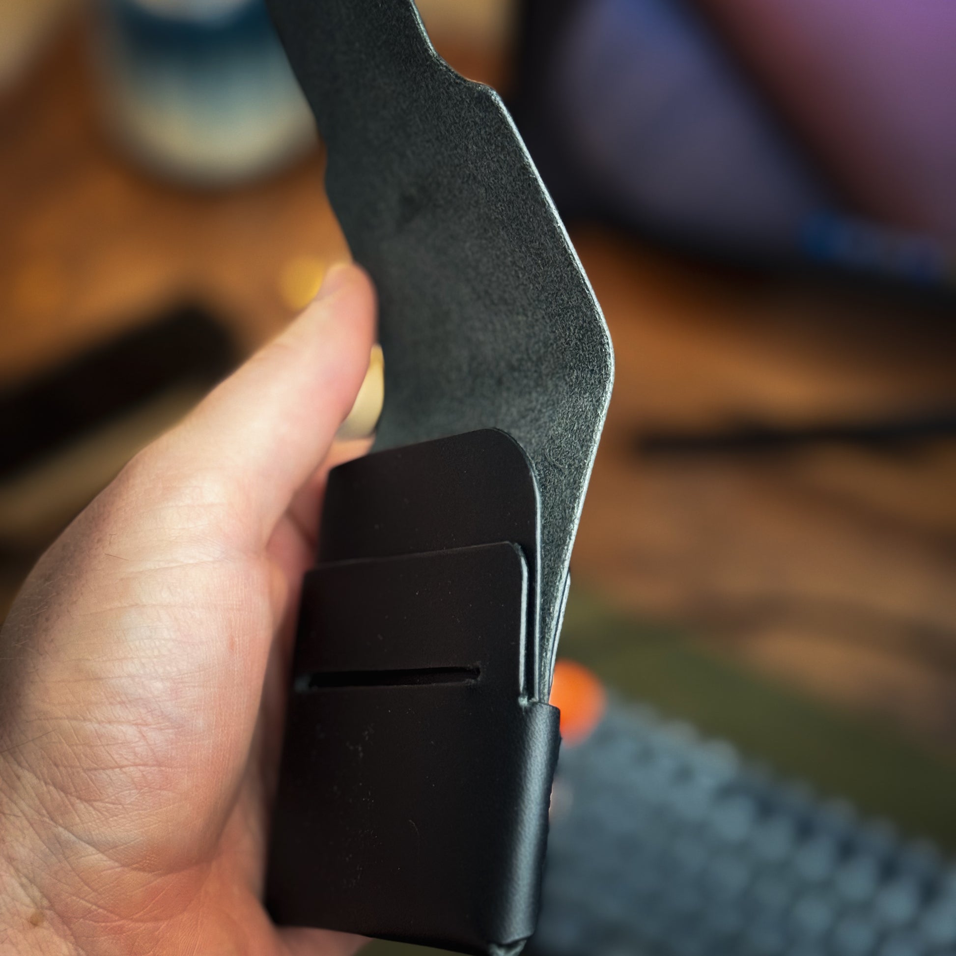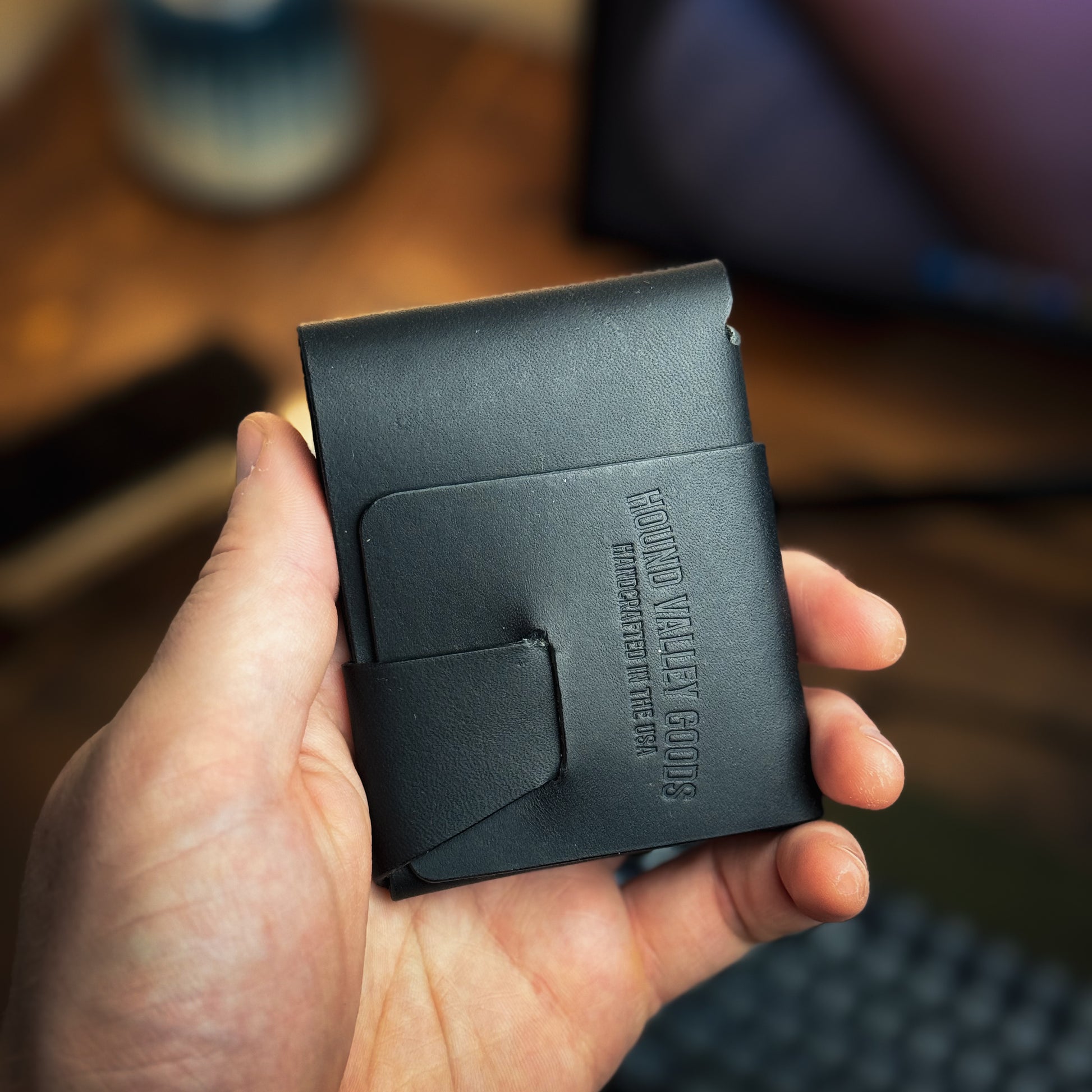 The Stitchless Buck features a slide-thru pocket on the back where the leather connects to itself via a slot and tab. This is great for your 1-2 most used cards. Under the flap, there's an additional pocket for another card. Behind this pocket, there's your main bank for your remaining cards and cash. Simply dump your cards and fold your cash in half. Then tuck that flap in and admire your beautiful new wallet.
